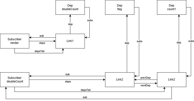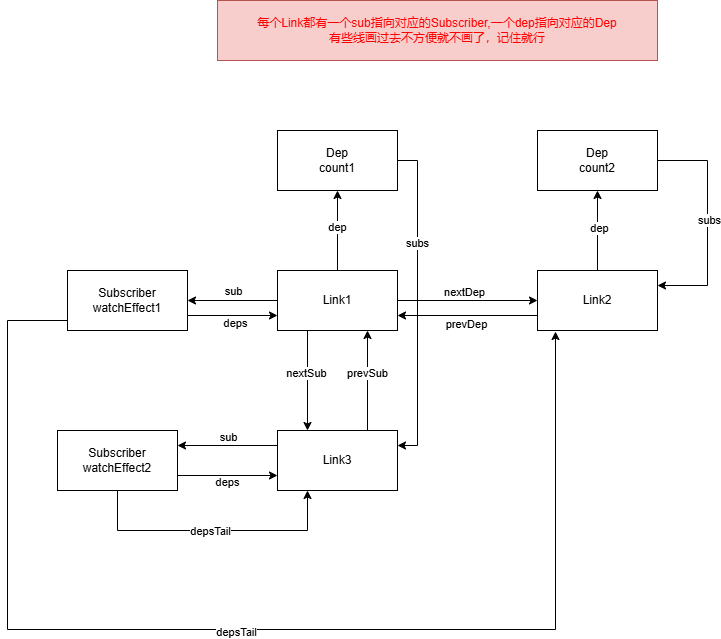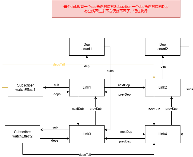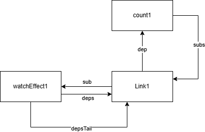 Link1 节点中保存了count1对应的dep以及watchEffect1, 分别用的是 sub 和 dep属性, 每个link节点都这样,后面不再讲